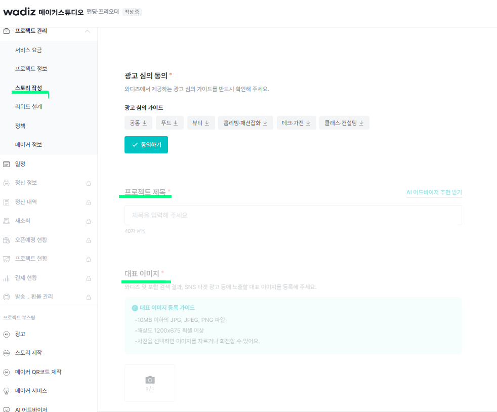 와디즈 프로젝트 정보 입력 단계가 끝나면 스토리를 작성해야 합니다.