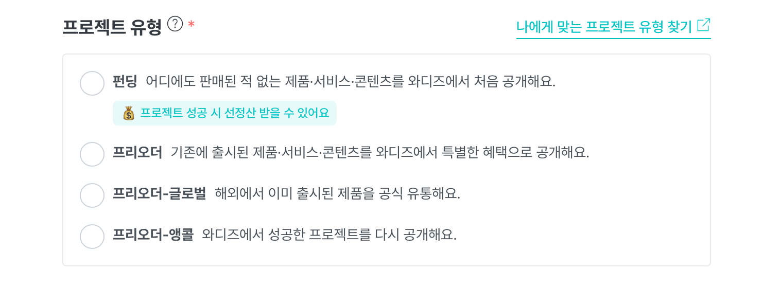 와디즈 프로젝트 유형에는 4가지가 있습니다.