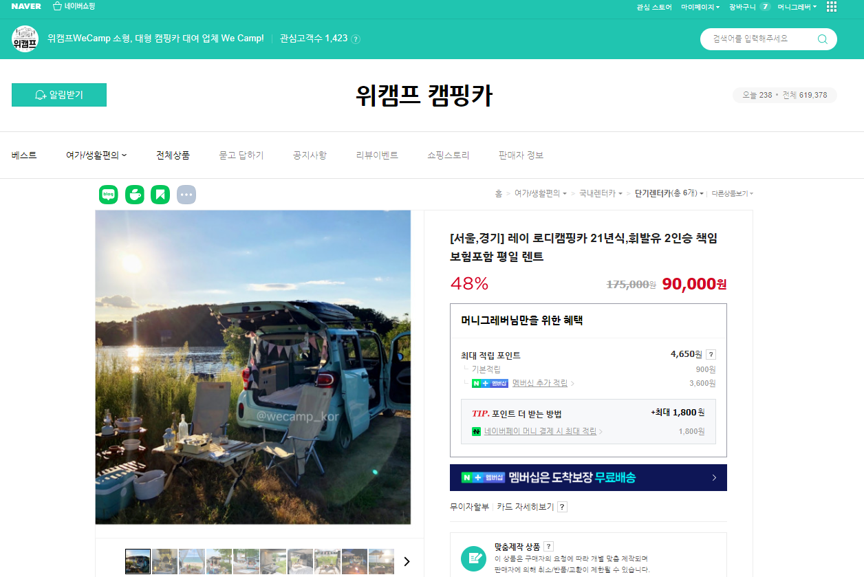 위캠프 캠핑카 업체에서는 레이 캠핑카 렌트를 주중 1일 기준 9만원, 주말 1일 기준 약 14만 원에 대여가 가능합니다. 그리고 캠핑장비도 2~3만 원 내에 대여가 가능하니 자세한 가격은 해당 홈페이지에서 확인하시기 바랍니다. (보험비 별도 추가)