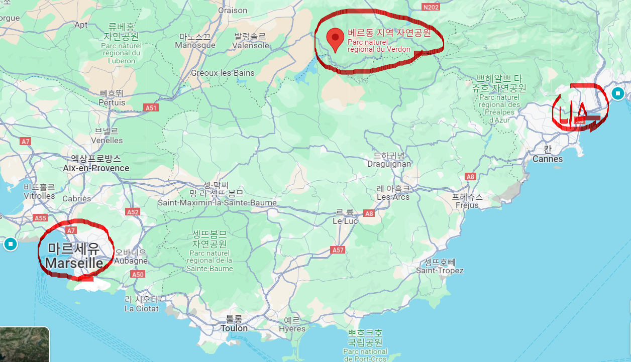 베르동 협곡은 프랑스에서 가장 깊은 빙하 협곡입니다. 그 길이가 무려 25km나 된다고 합니다. 베르동강의 색이 에메랄드 빛으로 아름답게 보이는 이유는 양쪽의 절벽에서 석회암 성분이 녹아 있기 때문입니다. 베르동 협곡의 위치는 마르세유와 니스의 중간 정도의 지점으로 마르세유에서도 2시간, 니스에서도 2시간 정도 소요되는 위치에 있습니다.